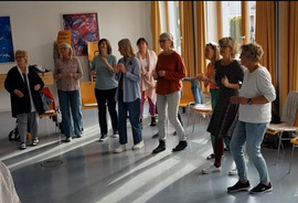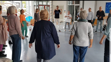 Nach der Mittagspause ging es musikalisch dann auch ans Experimentieren. Markus Detterbeck referierte kurz über die afrikanische Musik (u.a. Lieder, die von Sklaven gesungen wurden), in der spontan über die Melodie eine neue gelegt wird. Nachdem er dieses vortrefflich demonstriert hatte, wurden die Teilnehmer aufgefordert, sich zu trauen und es auszuprobieren. Tatsächlich wurden einige immer mutiger, denn falsch gab es nicht und es entstand ein ganz neuer Klangerlebnis. Weitere Lieder mit Bewegung sorgten dafür, dass ein harmonisches Ganzes mit allen 20 Teilnehmern zustande kam, die alle mit Begeisterung bei der Sache waren.