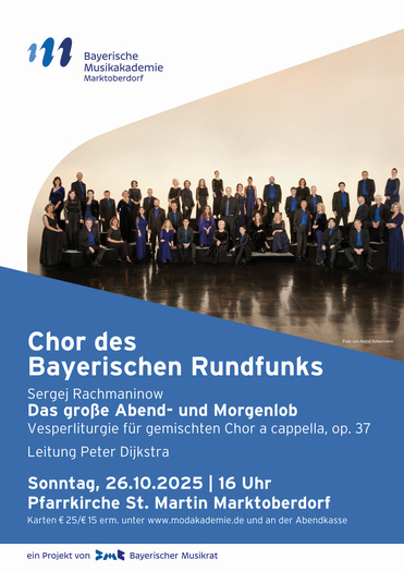 Die Bayerische Musikakademie Marktoberdorf freut sich, dieses Ensemble nach dem begeisternden Konzert im Jahr 2024 erneut begrüßen zu dürfen. „Es ist ein großes Geschenk, dass der Chor des Bayerischen Rundfunks wieder auf Einladung der Akademie in Marktoberdorf zu erleben ist“, sagt der künstlerische Leiter Bernhard van Almsick. „Mit der ‚Vesper‘ steht ein Werk auf dem Programm, das tief berührt, in seiner spirituellen Kraft erfüllt und in der Pfarrkirche St. Martin sicher zu einem unvergesslichen Erlebnis wird.“