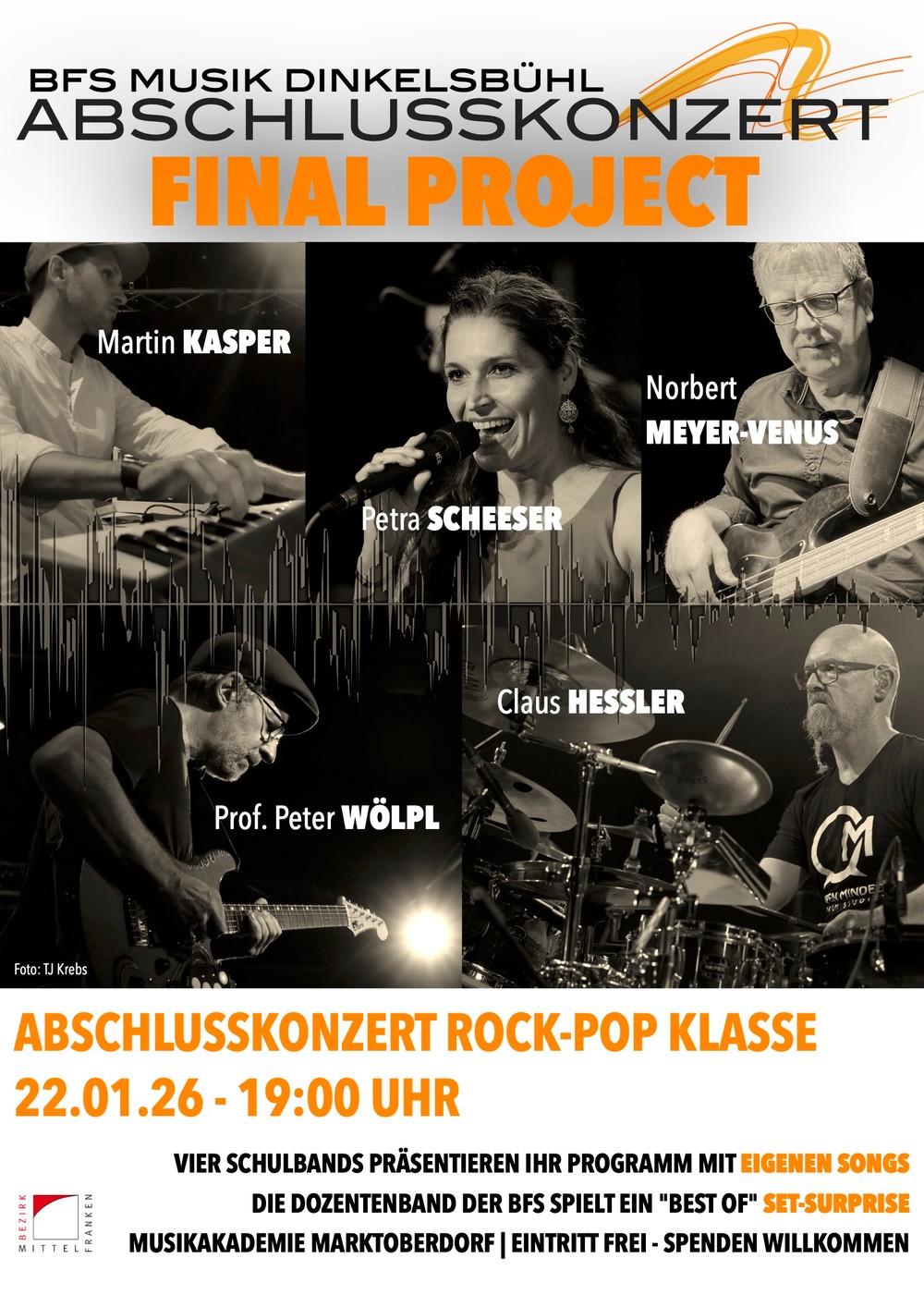 Im Rahmen des „Final Project“ zeigen die Bands am Donnerstag, 22. Januar 2026, 19:00 Uhr das musikalische Ergebnis der Woche: eigene Kompositionen, individuelle Sounds und stilistische Vielfalt aus dem Bereich Rock und Pop. Ein besonderes Highlight des Abends bildet der Auftritt der Dozentinnen- und Dozentenband der BFS, die das Konzert traditionell mit BEST OF SET-SURPRISE beschließt. Mit dabei sind Petra Scheeser (Gesang), Martin Kasper (Keyboards), Peter Wölpl (Gitarre), Norbert Meyer-Venus (Bass) und Claus Hessler (Schlagzeug). Claus Hessler ist in Marktoberdorf ein altbekannter Gast – bereits bei den legendären RHYTHM-Kursen wirkte er als Dozent mit.