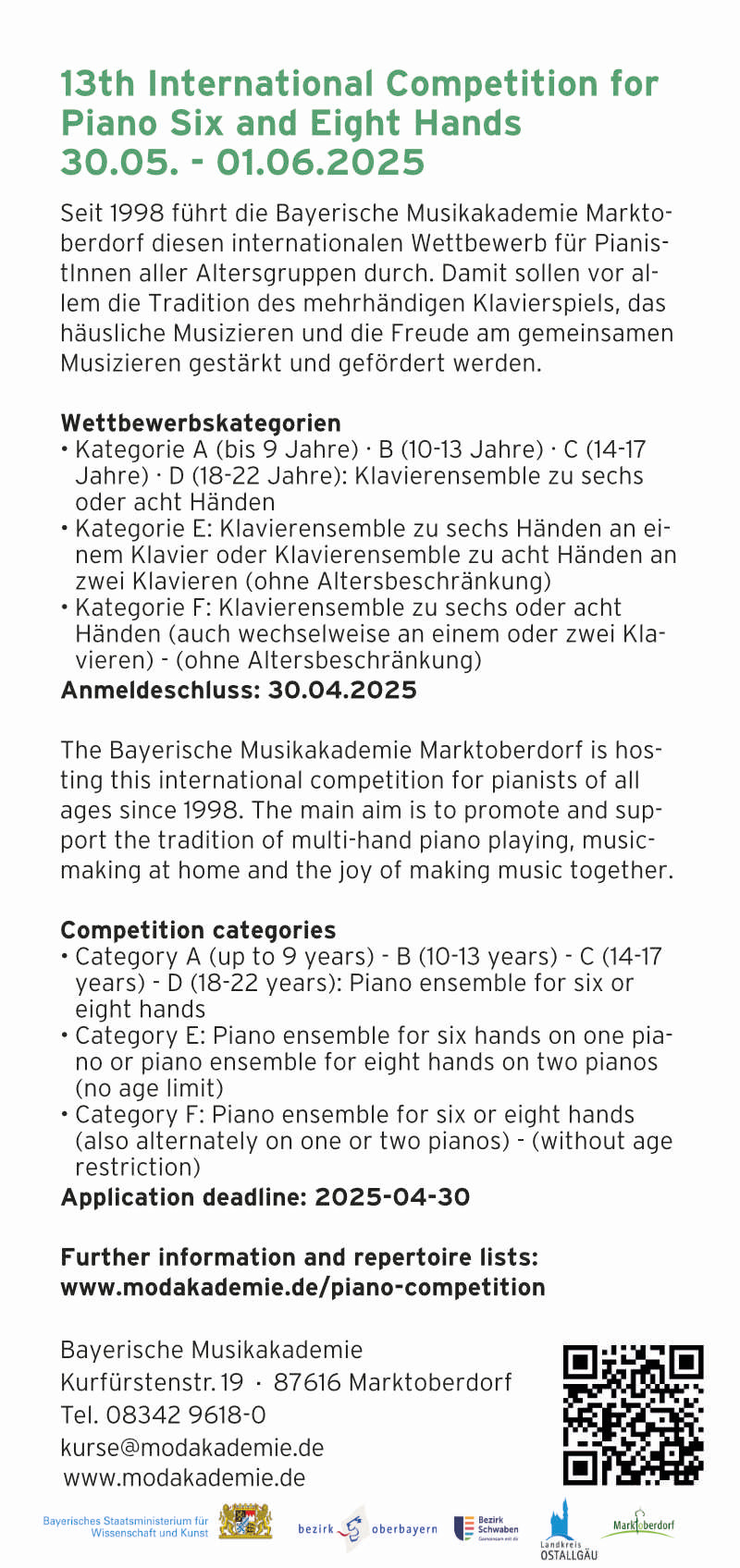 Zum 13. Mal findet der europaweit einzigartige Internationale Wettbewerb für Klavier zu sechs oder acht Händen in der Bayerischen Musikakademie Marktoberdorf statt: 30. Mai bis 01. Juni 2025. INFO UND ANMELDUNG
