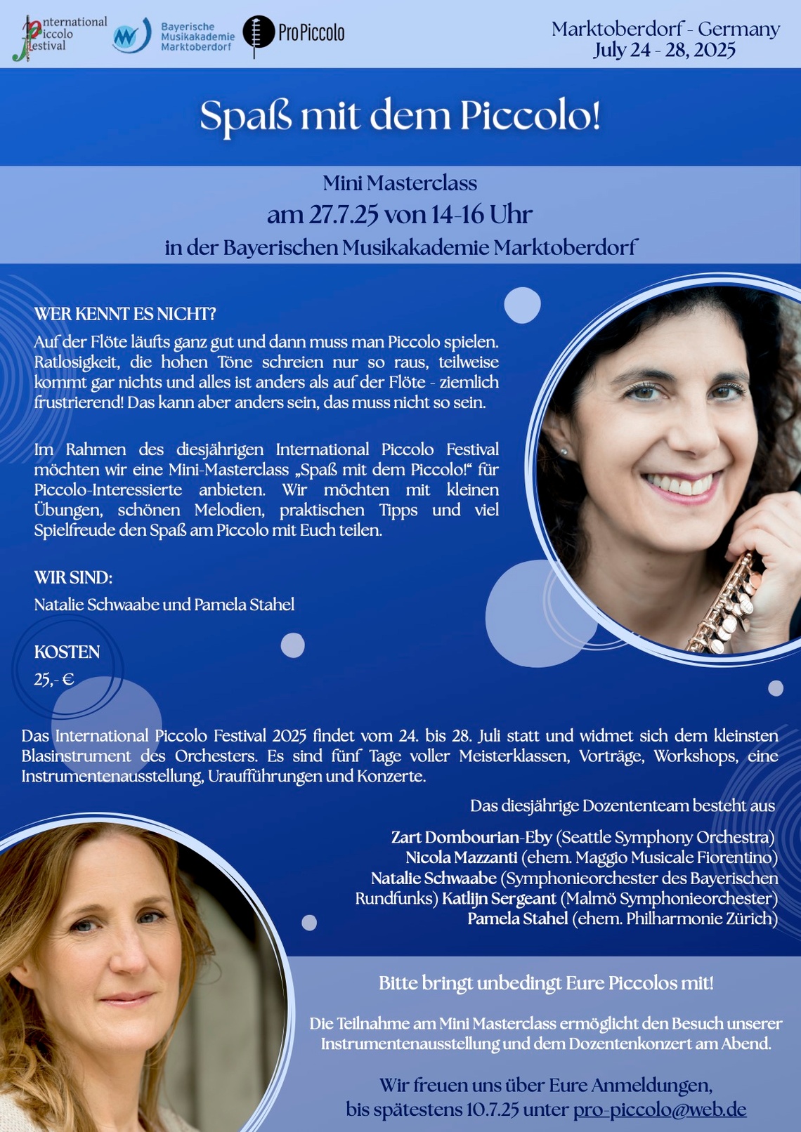 Die Mini-Masterclass “Spaß mit dem Piccolo!” findet am Sonntag, den 27.7 von 14 bis 16 Uhr statt. Die Dozenten sind Natalie Schwaabe (Symphonieorchester des Bayerischen Rundfunks) und Pamela Stahel (ehem. Philharmonie Zürich). Die Kosten dafür sind 25 €.