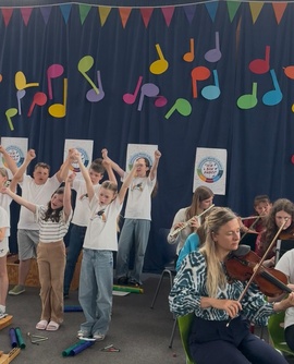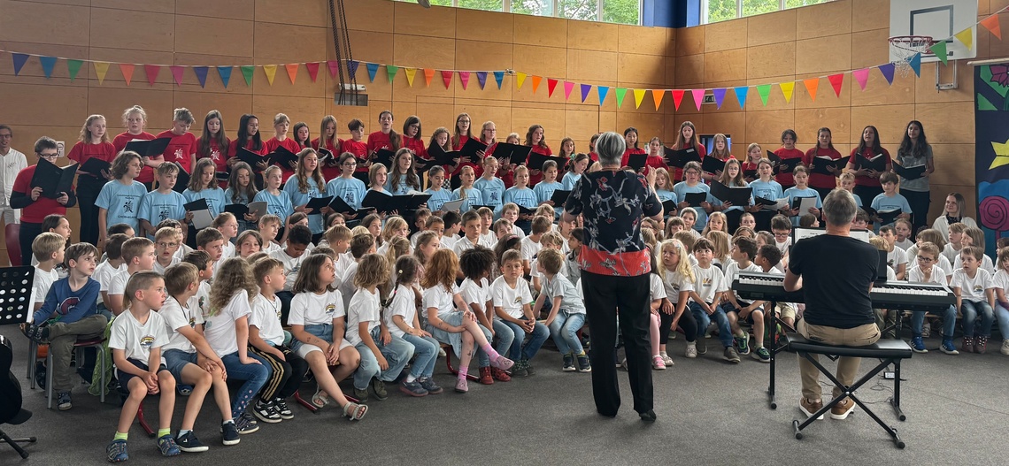 230 Kinder und Jugendliche aus dem Kindergarten Arche Noah, der Regenbogen-Grundschule Elsendorf sowie den Chorklassen und dem Orchester des Gabelsberger-Gymnasiums Mainburg eröffnen gemeinsam mit viel Schwung und Freude den Aktionstag Musik 2025. Tatkräftig unterstützt werden sie dabei von der Kindergartenleitung und den Musiklehrkräften sowie auch von der Grundschul-Musikpatin Julia Bassler, Geigerin im Münchner Rundfunkorchester.