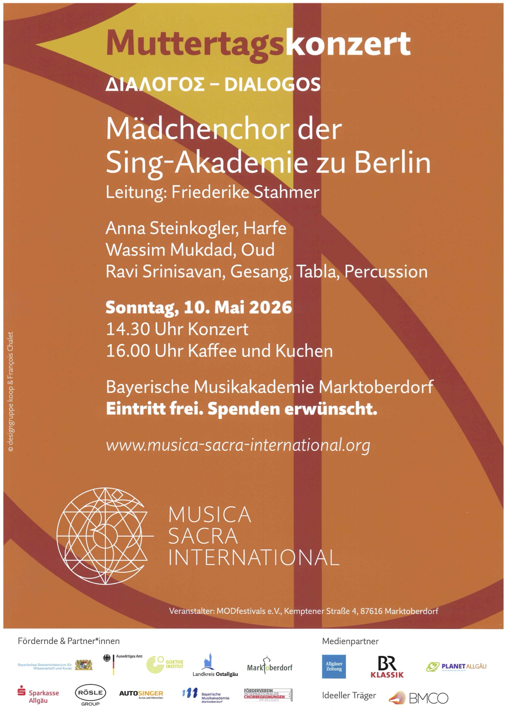 Der Mädchenchor der Sing-Akademie zu Berlin präsentiert das interreligiöse Konzertprojekt ΔΙΑΛΟΓΟΣ – DIALOGOS. Rund 45 Sängerinnen im Alter von 13 bis 20 Jahren gestalten gemeinsam mit einer Harfenistin, einem Oud-Spieler und einem Tabla-Spieler ein eindrucksvolles Programm, das musikalische Brücken zwischen Kulturen und Glaubenstraditionen schlägt.