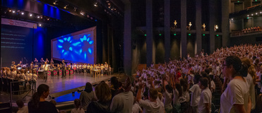 Über 1600 Kinder beim Musikmitmachkonzert „WM der Tiere“ im Festspielhaus in Füssen.