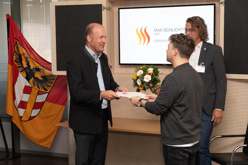 Der 32-jährige Popkünstler und Gründer der Band „Killerpilze“, mit Erfahrung von über 700 Konzerten auf internationalen Bühnen und 7 veröffentlichten Studioalben, ist bereits weit über die Landesgrenzen als Gitarrist, Songschreiber und musikalischer Kopf der „Killerpilze“ bekannt. Als Gründer des EMG Musikinstituts in Breitental (Krumbach) im Jahr 2014 gibt er sein Wissen als Musiklehrer mit großem Erfolg weiter. Als Kunstfigur Max Moon hat er gemeinsam mit der Augsburger Regisseurin Leonie Pichler an den Texten zu neuen Werken gearbeitet. 2019 veröffentlichte er audiovisuelle Produktionen in Zusammenarbeit mit seinem Bruder David Schlichter. Unter seinem Namen „Max Schlichter“ soll sein 1. Soloalbum erscheinen. Dafür und für die anschließenden Konzerte erhält er einen Förderpreis über 15.000 Euro.