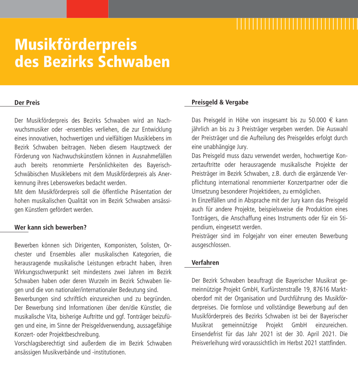 Die Bewerbungen für das Jahr 2021 müssen schriftlich bis 30. April 2021 bei der Bayerischer Musikrat gemeinnützige Projekt GmbH, die vom Bezirk Schwaben mit der Organisation und Durchführung des Musikförderpreises beauftragt ist, eingegangen sein.