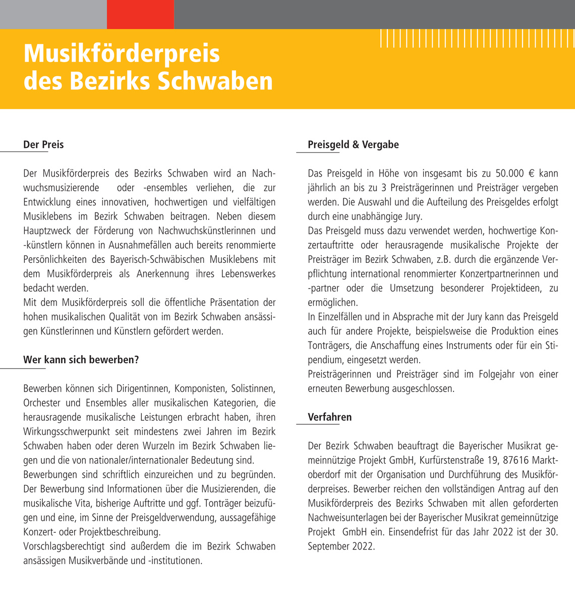 Sämtliche Details zum Musikförderpreis und zur Bewerbung finden Sie außerdem unter "Allgemeine Informationen".