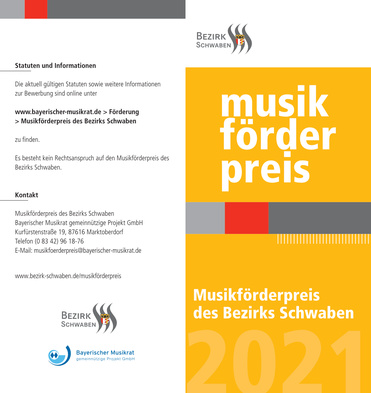 Der Festakt für die Verleihung des Musikförderpreis des Bezirks Schwaben 2021 konnte aufgrund der Corona Situation nicht durchgeführt werden. Nun wurde aber ein neuer Termin angesetzt: am 6.5.2022 werden die Preise feierlich im Rahmen einer geschlossenen Veranstaltung verliehen. Die Veröffentlichung der Preisträger folgt direkt im Anschluss daran.