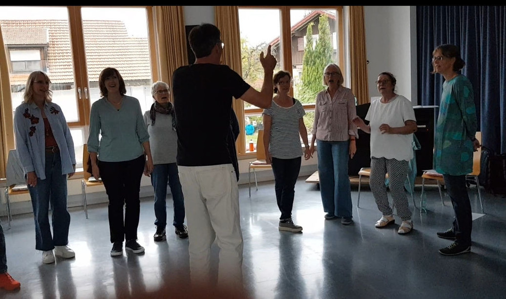 Am 14.10.2023 fand in Buchenberg von 10 – 17 Uhr ein Workshop mit dem vielseitigen Referenten statt. Markus Detterbeck, der in vielschichtigen musikalischen Richtungen unterwegs ist, verstand es von Anfang an, die Teilnehmer mitzunehmen und ihre ungeteilte Aufmerksamkeit zu bekommen. Mit verschiedenen Rhythmus- und Intonationsübungen gelang es den Sängerinnen und Sängern sich musikalisch aufeinander einzulassen und aufmerksam gegenüber der Gruppe zu werden. Erweitert wurde dies dann durch das Erlernen kurzer Lieder, deutsch, afrikanisch, lateinamerikanisch, und zwar ohne Blatt, die durch Bodypercussion im Gleichklang gehalten wurden. Dabei erklärte er auch anschaulich, dass durch Körperbewegung und auch Heben der Mundwinkel ein vollerer Ton erreicht werden kann und die Spannung besser gehalten wird. Mehrstimmige Stücke und unterschiedliche Texte, die gleichzeitig gesungen wurden, erforderten die volle Konzentration der Mitwirkenden.