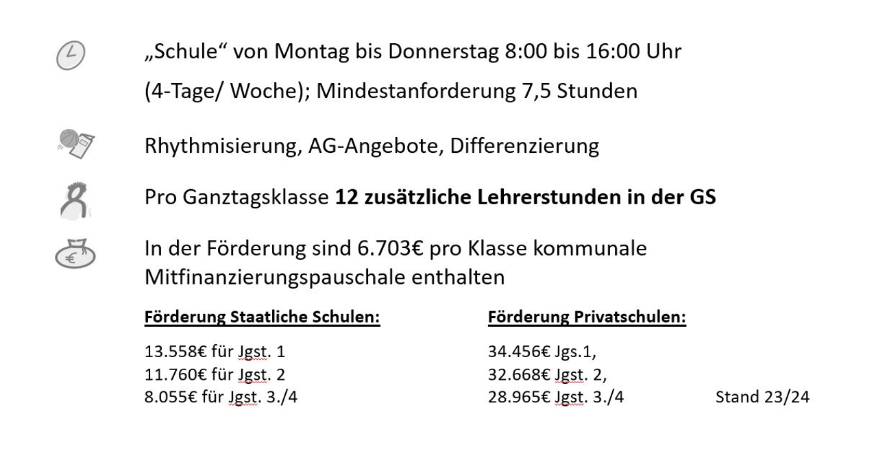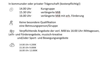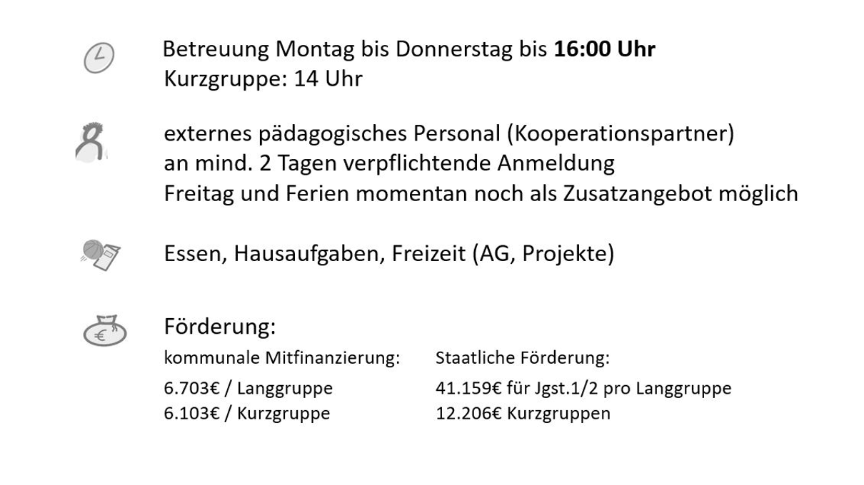 Angebote im Anschluss an den regulären Unterricht. Die Leitung hat der Träger, der auch das Personal stellt. Kosten für das Mittagessen tragen die Eltern, je nach den Gegebenheiten vor Ort erhalten sie evtl. einen Zuschuss.