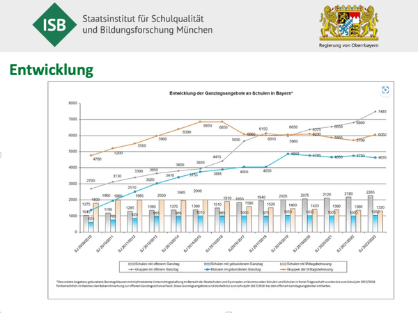 Stefanie Pistor, Institutsrektorin am Staatsinstitut für Schulqualität und Bildungsforschung, berichtet von der Studie zur Entwicklung für Ganztagsschulen zwischen 2005 und 2019 und erläutert das Ganztagsförderungsgesetz (GaFöG), das ab dem Schuljahr 2026/27 in Kraft tritt. Ab diesem Zeitpunkt mit dem Eintritt in die erste Klassenstufe und bis zum Beginn der fünften Klassenstufe hat das Schulkind einen Anspruch auf Förderung in einer Tageseinrichtungen an Werktagen im Umfang von acht Stunden täglich.