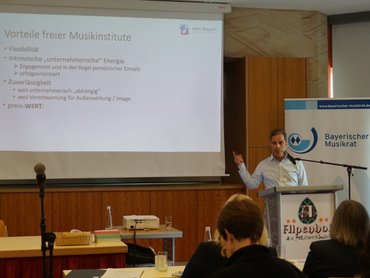 In seinem Vortrag gab er einen Einblick in die Organisation, Struktur, Wertevorstellung und Aufgabenbereiche freier Musikinstitute und deren Vorteile.
