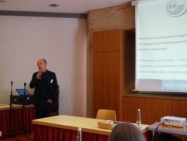 In der Hinführung zum Thema beschreibt Robert Wagner die Finanzierung, Aufgaben und Möglichkeiten der Sing- und Musikschulen in Bayern als eigenständige Bildungseinrichtung. Bemessen am Gesamtvolumen der Unterrichtsangebote der Sing- und Musikschulen dienen anteilig 2% der Berufsvorbereitung und 98% der Breitenbildung. Bei allem sehen sich die Sing- und Musikschulen in der Pflicht, Leistung, Qualität und Teilhabe zu gewährleisten. Teil-Habe an musisch-kultureller Bildung sei ein Menschenrecht und die Befähigung zur musikalischen Teil-Gabe das, was der VBSM im Rahmen der Zuständigkeit und Möglichkeiten der einzelnen Sing- und Musikschule und leiste. Schwierig werde es, wenn das Engagement im Bereich Ganztagskooperation das bisher geleistete Aufgabenspektrum gefährdet oder eine Sing- und Musikschule vor Ort gar nicht existiert.