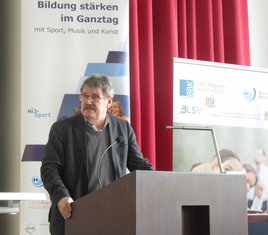Michael Rißmann, Leiter des Referats „Ganztagsschule, Mittagsbetreuung“ im Bayerischen Bildungsministerium, gab einen ausführlichen Blick auf Zielsetzung und Ausweitung des Ganztags in Bayern und unterstrich die Bedeutung der "Kulturellen Bildung" im Zusatzangebot und die Rolle der externen Kräfte.