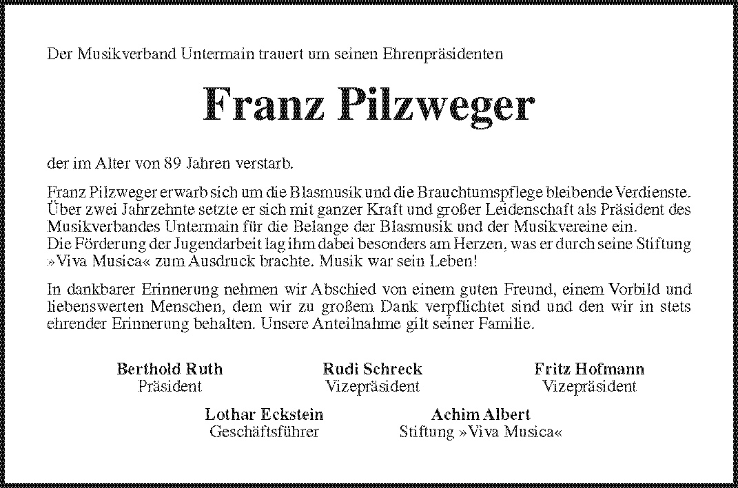 Franz Pilzweger erwarb sich um die Blasmusik und die Brauchtumspflege insgesamt und in Unterfranken besondere bleibende Verdienste.