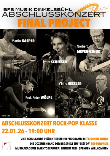 Im Rahmen des „Final Project“ zeigen die Bands am Donnerstag, 22. Januar 2026, 19:00 Uhr das musikalische Ergebnis der Woche: eigene Kompositionen, individuelle Sounds und stilistische Vielfalt aus dem Bereich Rock und Pop. Ein besonderes Highlight des Abends bildet der Auftritt der Dozentinnen- und Dozentenband der BFS, die das Konzert traditionell mit BEST OF SET-SURPRISE beschließt. Mit dabei sind Petra Scheeser (Gesang), Martin Kasper (Keyboards), Peter Wölpl (Gitarre), Norbert Meyer-Venus (Bass) und Claus Hessler (Schlagzeug). Claus Hessler ist in Marktoberdorf ein altbekannter Gast – bereits bei den legendären RHYTHM-Kursen wirkte er als Dozent mit.