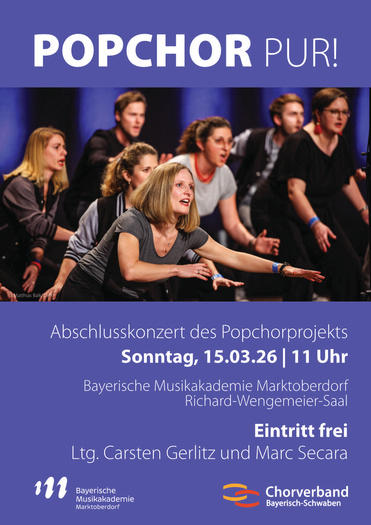 Am Sonntag, 15. März 2026, präsentiert der Projektchor um 11:00 Uhr die Ergebnisse seiner Arbeit im Richard-Wengenmeier-Saal der Bayerischen Musikakademie Marktoberdorf. Unter dem Titel „Popchor Pur“ erwartet das Publikum ein abwechslungsreiches Konzertprogramm voller Rhythmus, Emotion und mitreißender Chorklänge.