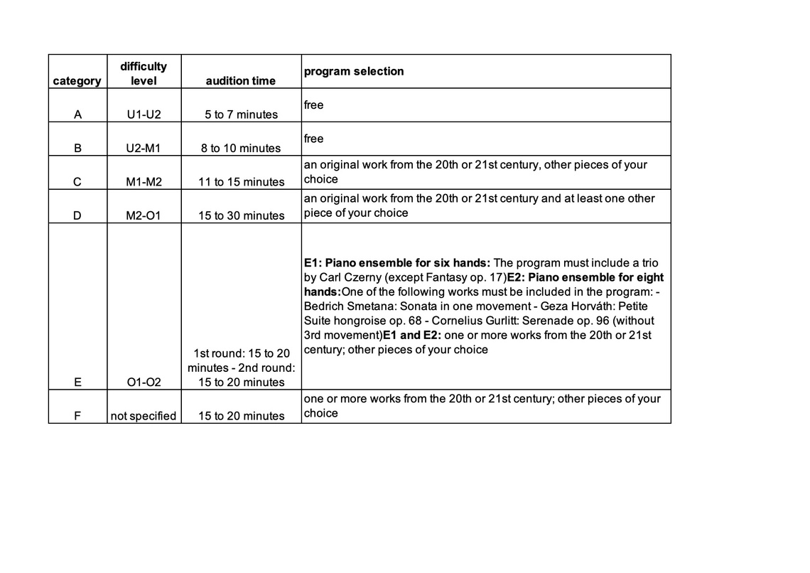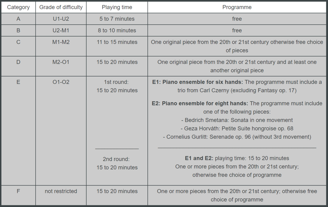 | without any age limit: | Category F: | Piano ensemble for six or eight hands (it is possible to alternate between playing one and two pianos) |
