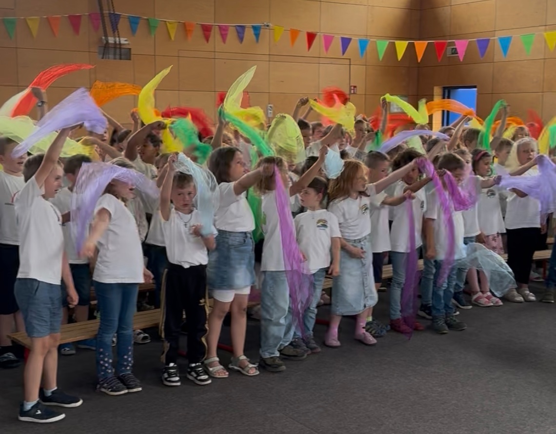 230 Kinder und Jugendliche aus dem Kindergarten Arche Noah, der Regenbogen-Grundschule Elsendorf sowie den Chorklassen und dem Orchester des Gabelsberger-Gymnasiums Mainburg eröffnen gemeinsam mit viel Schwung und Freude den Aktionstag Musik 2025. Tatkräftig unterstützt werden sie dabei von der Kindergartenleitung und den Musiklehrkräften sowie auch von der Grundschul-Musikpatin Julia Bassler, Geigerin im Münchner Rundfunkorchester.