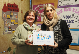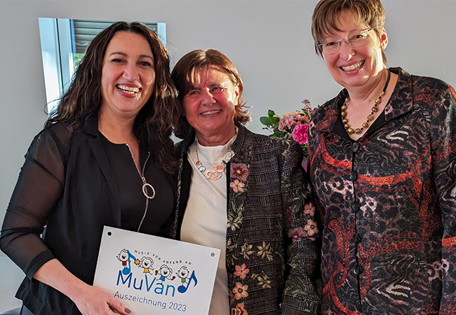 „Was wir an diesen Standorten vorgefunden haben, ist für Inhouse-Schulungen optimal, ein Musikzimmer, Instrumente und ein Personal, das gerne für andere die Türen öffnet,“ betont Dagmar Winterhalter-Salvatore und deutet auf die Plakette. „Diese Plakette findet ihren Platz neben der Eingangstür, damit vor allem die Eltern wissen, dass in diesen Häusern Musik mit fachlichem Knowhow und mit der entsprechenden Ausstattung stattfindet. Und wer jemals in seinem Leben selbst Musik gemacht hat, weiß, wie beglückend das ist!"