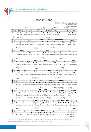 HAND IN HAND - Unterrichtsmodell, Liedtext mit Akkorden in C und D, Liedblatt in C-Dur, Begleitsätze ohne Noten für Stabspiele und Rhythmusinstrumente, Bildkarten, AB Freundschaftsbänder