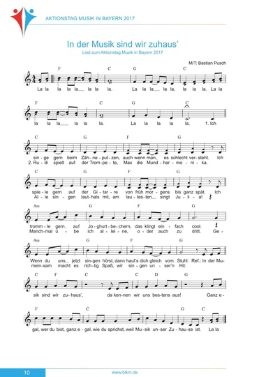 Im Auftrag der BLKM hat der Münchner Pianist, Komponist und Arrangeur Bastian Pusch das Mottolied für den Aktionstag Musik in Bayern 2017 mit dem Titel IN DER MUSIK SIND WIR ZUHAUS' komponiert und für verschiedenste Ensembles arrangiert. Viel Freude beim Singen und Musizieren des diesjährigen "Aktionstags-Liedes".