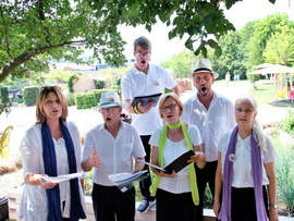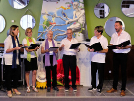 Überall auf dem Gelände war die besondere Stimmung dieses Tages hör- und spürbar. So fand sich schon bei unserer Einsing-Probe an einem schattigen Plätzchen im Freien unerwartet interessiertes Publikum ein, und auch, als wir nach dem Auftritt in den Schaugärten noch ein privates Ständchen sangen, gesellten sich Zuhörer dazu, die nach mehr „verlangten“, was wir gerne erfüllten! Zwischendurch war ausreichend Gelegenheit, anderen Gruppen zuzuhören und natürlich auch die Gartenschau mit ihren Anlagen, Infoständen, Blumenbeeten und mit fränkischem Wein zu genießen. Was für ein inspirierender Sommertag!