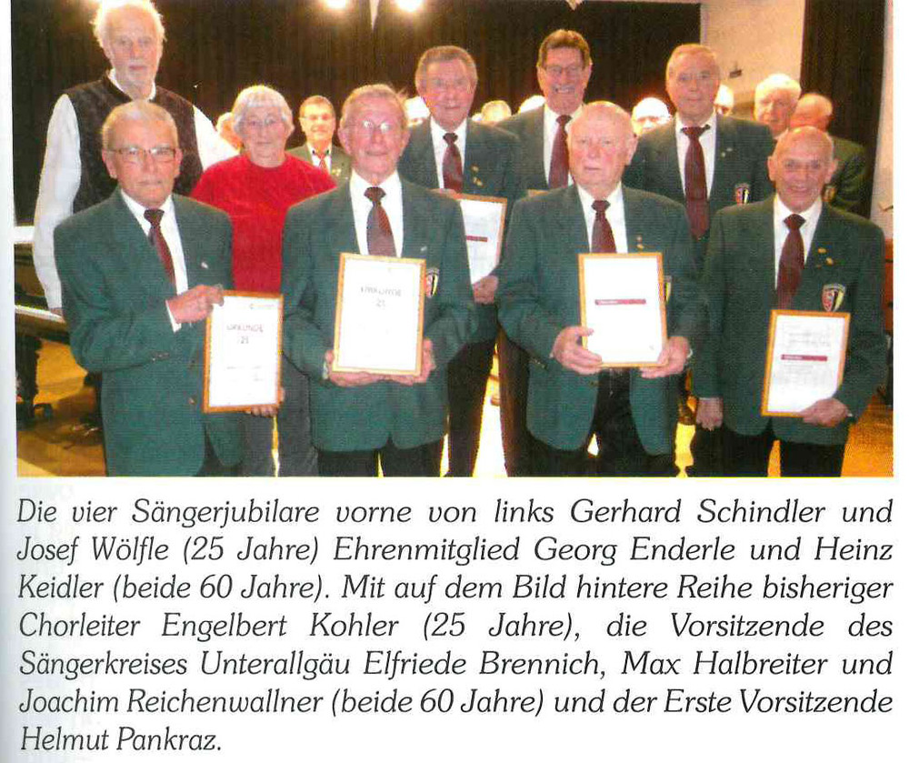 Im Rahmen einer Familienfeier hat der Erste Vorsitzende Helmut Pankraz langjährige Sänger ausgezeichnet. Ehrenmitglied Josef Enderle und Heinz Keidler, Max Halbreiter und Joachim Reichenwallner erhielten für 60 Jahre aktive Mitwirkung Urkunden und Ehrennadeln von der Vorsitzenden des Sängerkreises Unterallgäu, Elfriede Brennich, überreicht. Gerhard Schindler und Josef Wölfle singen bereits 25 Jahre im Chor.