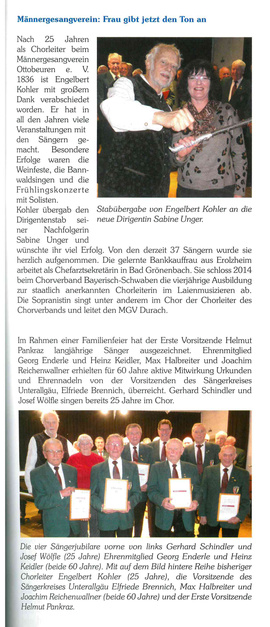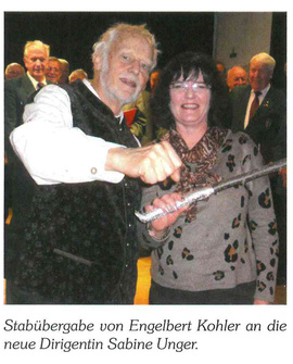Kohler übergab den Dirigentenstab seiner Nachfolgerin Sabine Unger und wünschte ihr viel Erfolg. Von den derzeit 37 Sängern wurde sie herzlich aufgenommen. Die gelernte Bankkauffrau aus Erolzheim arbeitet als Chefarztsekretärin in Bad Grönenbach. Sie schloss 2014 beim Chorverband Bayerisch-Schwaben die vierjährige Ausbildung zur staatlich anerkannten Chorleiterin im Laienmusizieren ab. Die Sopranistin singt unter anderem im Chor der Chorleiter des Chorverbands und leitet den MGV Durach.