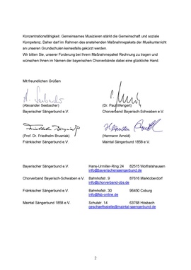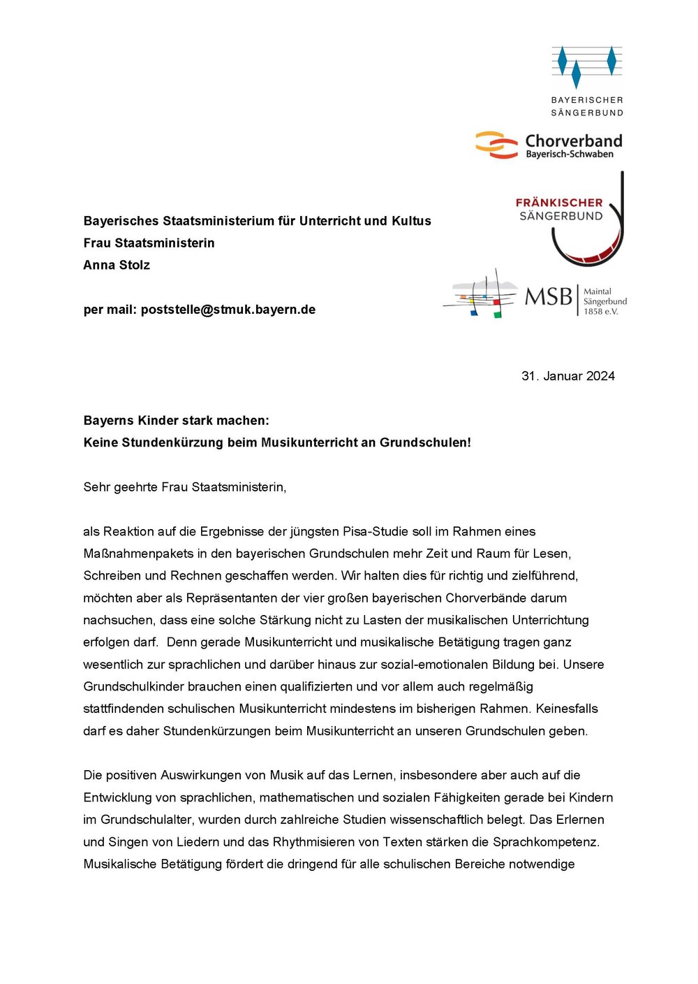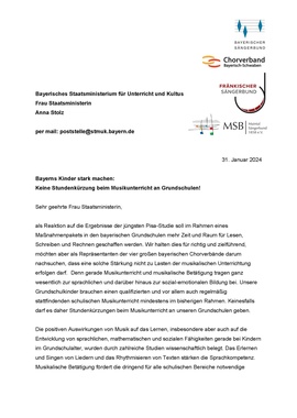 Auf Initiative des Chorverbands Bayerisch-Schwaben haben sich nun auch die vier Bayerischen Chorverbände, die rund 80.000 aktive Sängerinnen und Sänger in Bayern vertreten, an die Bayerische Staatsministerin für Unterricht und Kultus, Anna Stolz, gewandt. „Wir betrachten es als Verpflichtung, uns für den Erhalt des Musikunterrichts an Grundschulen mindestens im bisherigen Umfang einzusetzen“, begründet CBS-Präsident Dr. Paul Wengert diesen Schritt, „um zu verhindern, dass es zu Stundenkürzungen beim Musikunterricht kommt“.