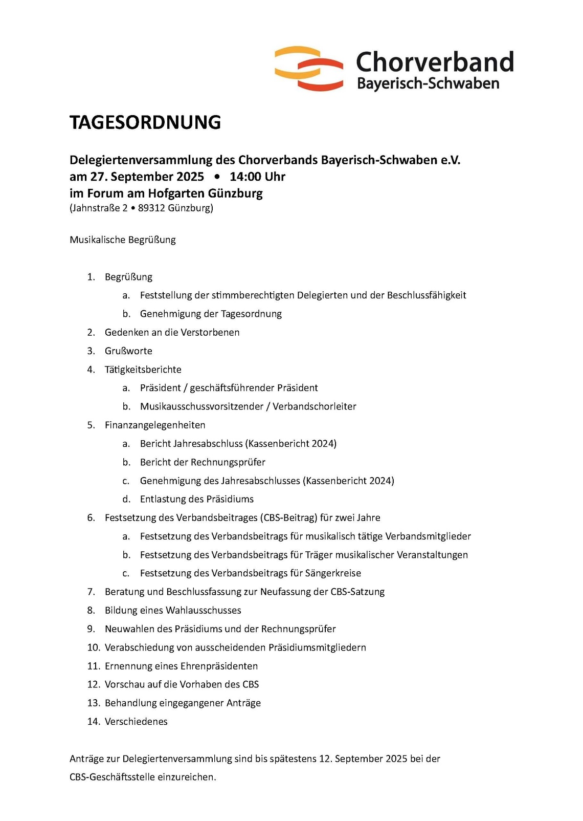 Satzungsgemäß tagt das höchste Organ des Chorverbands Bayerisch-Schwaben e.V. alle zwei Jahre. In diesem Jahr finden Neuwahlen für die Besetzung des CBS-Präsidiums statt. Das derzeitige CBS-Präsidium legt einen Kandidatenvorschlag vor, der Ihnen zusammen mit den weiteren Tagungsunterlagen (Jahresabschluss, Sachbericht, Satzungsneufassung, Verbandsbeitrag) Anfang September zugesandt wird. Dies ermöglicht eine zielgerichtete und konzentrierte Durchführung der umfangreichen Tagesordnung.