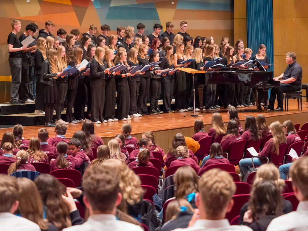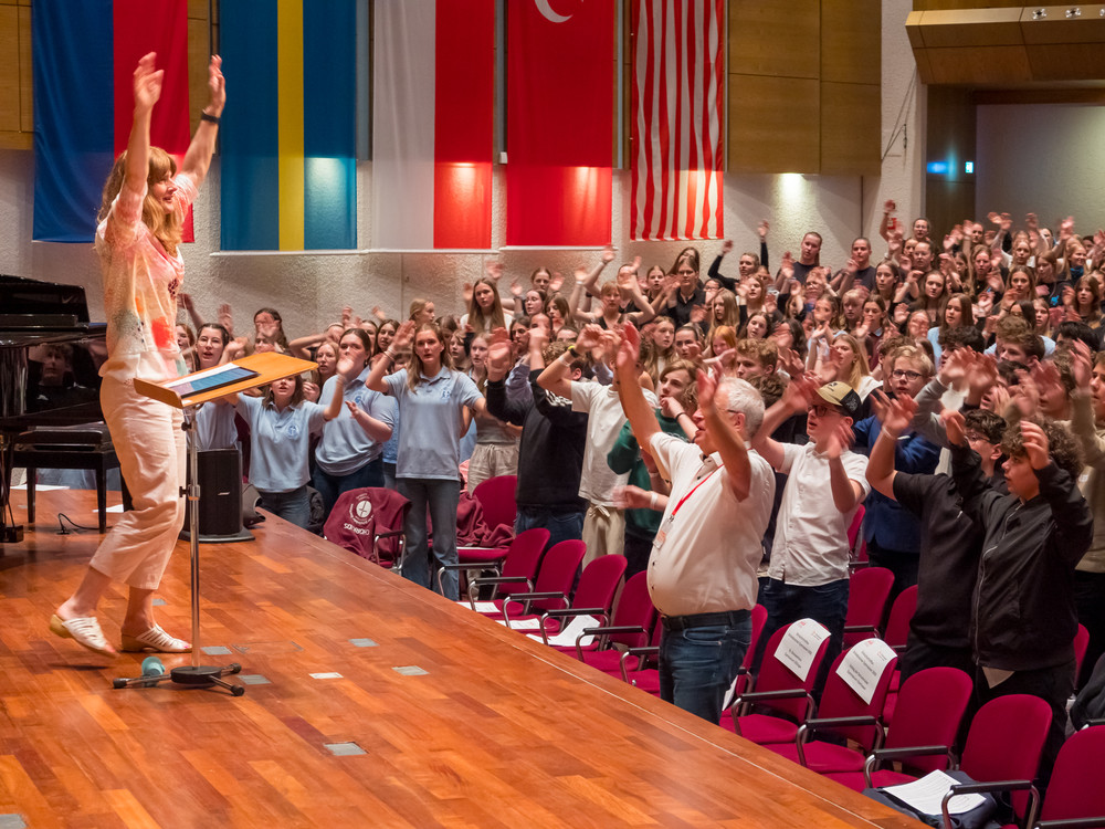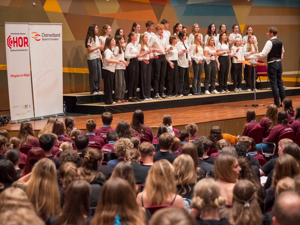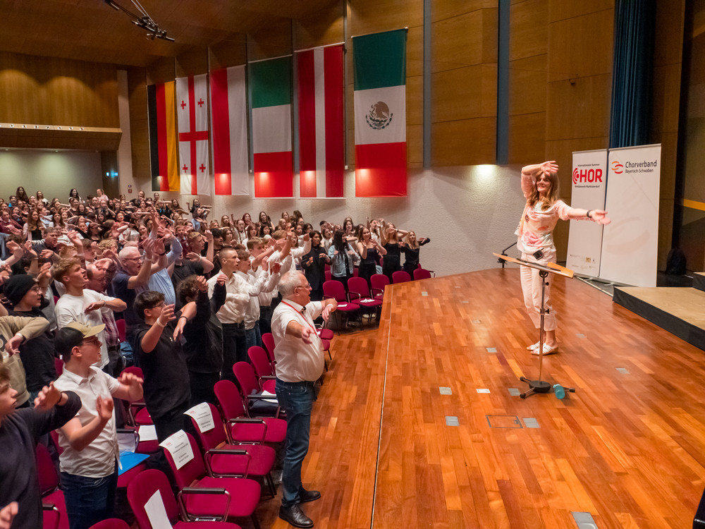 Noch bevor die ersten Töne des Kammerchor-Wettbewerbs erklangen, wurde im Modeon Marktoberdorf gesungen - und wie. Knapp 500 Schülerinnen und Schüler sind beim Schulchortreffen schwäbischer Gymnasien zusammengekommen. Eingeladen hatten der Chorverband Bayerisch-Schwaben (CBS), MODfestivals e.V. und die MB-Dienstelle der Gymnasien Schwabens mit Dr. Stefan Wolitz, dem zuständigen Fachreferenten. Ihr Plan: Die Jugend darf nicht vergessen werden! Und so bekamen Oberstufenchöre aus dem Verbandsgebiet die Chance, mit einem echten Profi zu arbeiten: der weltweit gefragten Chorleiterin Bernie Sherlock. Die Chöre stellten ihre eigenen Programme vor, ehe sie von Sherlock, die in der Jury des Wettbewerbs saß, gecoacht wurden. Nachmittags stand ein Workshop mit Sher lock auf dem Programm.