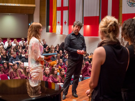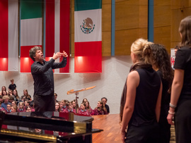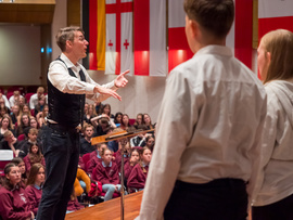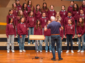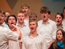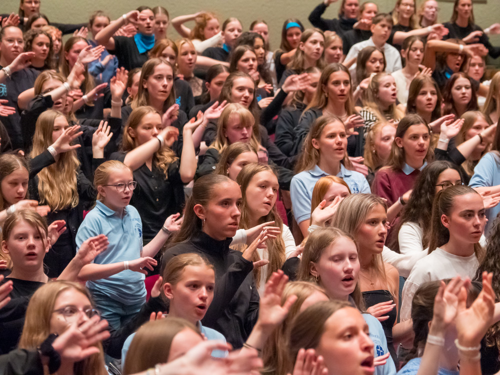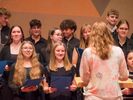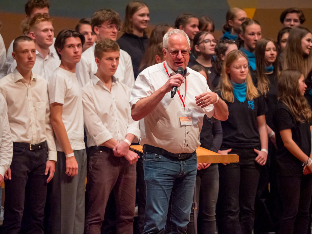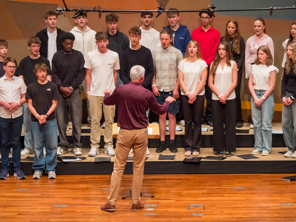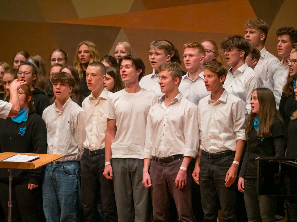 Noch bevor die ersten Töne des Kammerchor-Wettbewerbs erklangen, wurde im Modeon Marktoberdorf gesungen - und wie. Knapp 500 Schülerinnen und Schüler sind beim Schulchortreffen schwäbischer Gymnasien zusammengekommen. Eingeladen hatten der Chorverband Bayerisch-Schwaben (CBS), MODfestivals e.V. und die MB-Dienstelle der Gymnasien Schwabens mit Dr. Stefan Wolitz, dem zuständigen Fachreferenten. Ihr Plan: Die Jugend darf nicht vergessen werden! Und so bekamen Oberstufenchöre aus dem Verbandsgebiet die Chance, mit einem echten Profi zu arbeiten: der weltweit gefragten Chorleiterin Bernie Sherlock. Die Chöre stellten ihre eigenen Programme vor, ehe sie von Sherlock, die in der Jury des Wettbewerbs saß, gecoacht wurden. Nachmittags stand ein Workshop mit Sher lock auf dem Programm.