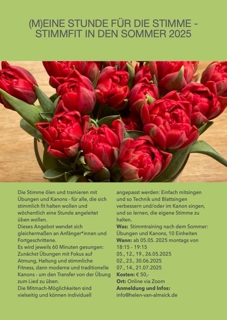 Die Stimme ölen und trainieren mit Übungen und Kanons - für alle, die sich stimmlich fit halten wollen und wöchentlich eine Stunde angeleitet üben wollen.