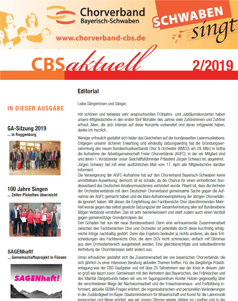 Brandneu erschienen: das CBS aktuell 02/019, die Mitgliederinformation des Chorverbands Bayerisch-Schwaben, mit vielen Informationen zum Verbandsleben, zu Fortbildungen und Veranstaltungen auf Chor-, Sängerkreis- und Verbandsebene