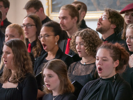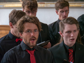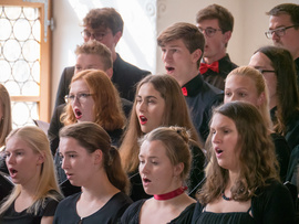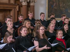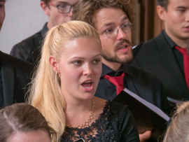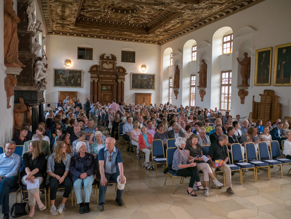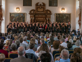 Als exquisites, ganz besonderes Event präsentierte die Schwäbische Chorakademie eine Vertonung des Shakespeare-Sonetts Nr. 29 „When in Disgrace“ von Linus Mödl (*1994). Der 24-Jährige Student der Musik ist Mitglied der Chorakademie und wurde natürlich von Chor und Zuhörern besonders gefeiert. Seine Komposition bietet dichten, modernen Chorklang und ausdrucksstarke Textinterpretation. In seinem ersten Teil erzählt das Sonett von einem Mann, der sein Schicksal bedauert, in Erinnerung an seine süße Liebe aber dann mit keinem König tauschen will. Der Chorsatz folgt dem Text nachempfindbar einfühlsam und endet hoffnungsfroh beschwingt. Tolle Leistung!