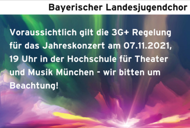 Für das Jahreskonzert des Bayerischen Landesjugendchores am kommenden Sonntag, 07.11., 19 Uhr, Hochschule für Musik und Theater München, gilt aufgrund der aktuellen Corona-Regelungen voraussichtlich die 3G+ Regel. Wir bitten alle Konzertbesucher dies zu beachten und die entsprechenden Nachweise vorzuhalten.