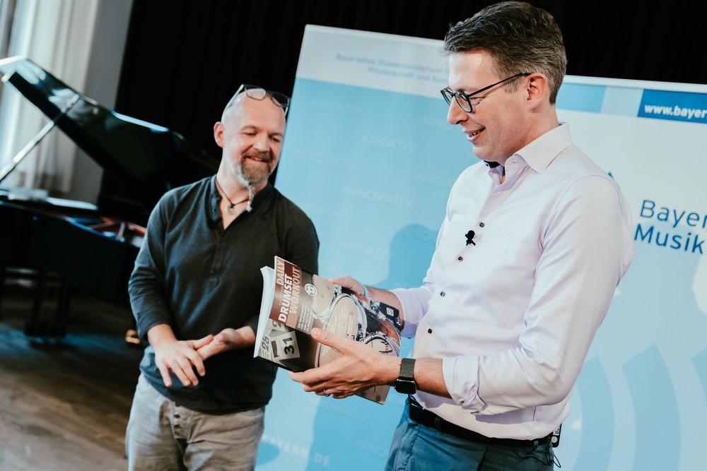 Der Bayerischer Kunstminister Markus Blume kam im Rahmen der Kampagne des Bayerischen Musikrats #MachMusik in den Genuss einer Schlagzeug-Schnupperstunde. Sein Lehrer war Claus Hessler, einer der renommiertesten Drummer Deutschlands, der auch bayerischer Schirmherr des Drumset - Instruments des Jahres 2022 ist. Ort des Geschehens war die Hochschule für Theater und Musik München, aufmerksam beobachtet wurden die beiden von BMR-Ehrenpräsident Dr. Thomas Goppel und der neuen Präsidentin der HMTM, Prof. Lydia Grün.