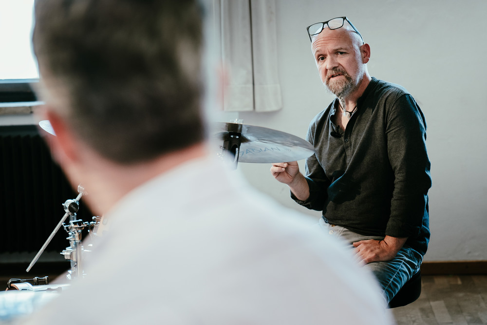 So startete auch für Markus Blume die erste Schlagzeugstunde wie für viele andere Anfänger weltweit mit TaKeDiMi – der Verbindung von Rhythmus mit Sprache und der Umsetzung in Beats. Schnell waren Schüler und Lehrer mittendrin, hochkonzentriert folgte Markus Blume den Ausführungen von Claus Hessler.