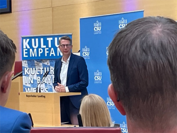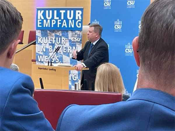 Beim Kulturempfang der CSU am Donnerstag, 15.06.2023, wurde der BMR von Jürgen Schwarz und Karin Rawe vertreten. Vor zahlreichen Repräsentanten aus den verschiedenen Sparten von Kunst und Kultur forderte Robert Brannekämper, Vorsitzender des Ausschusses für Wissenschaft und Kunst, für die kommende Legislaturperiode weitere Anstrengungen zur Unterstützung von Künstlerinnen und Künstlern, auch im finanziellen Bereich. Staatsminister Blume unterstrich die Freiheit der Kunst, die von der Politik respektiert werden müsse und bezeichnete die Laienmusik als den „Sound Bayerns“.
