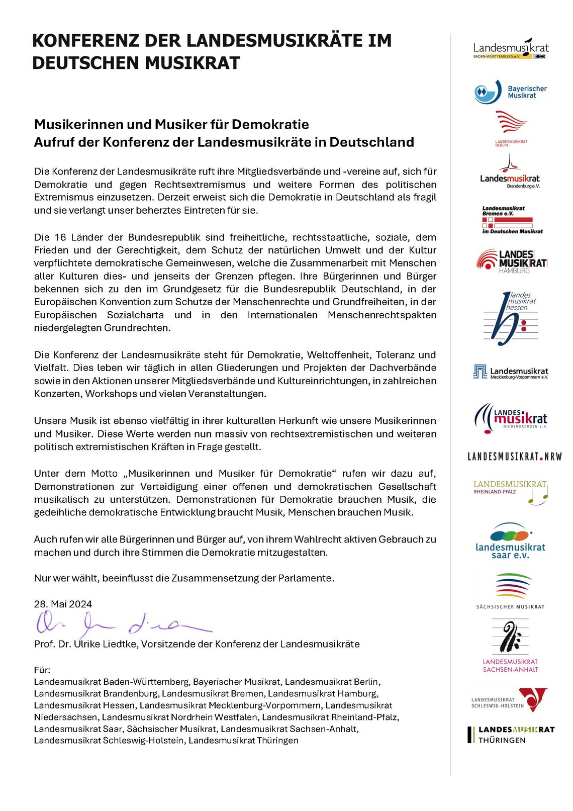 Musikerinnen und Musiker für Demokratie – Aufruf der Konferenz der Landesmusikräte in Deutschland