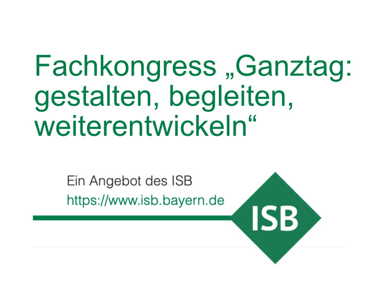 Das Referat Ganztag am Staatsinstitut für Schulqualität und Bildungsforschung (ISB) in Kooperation mit dem Staatsministerium für Unterricht und Kultus, dem Staatsministerium für Arbeit, Familie und Soziales, dem Institut für Frühpädagogik (IFP), der Akademie für Lehrerfortbildung und Personalführung (ALP) und den Regierungen der bayerischen Regierungsbezirke lädt pädagogische Fach- und Lehrkräfte, Schulleitungen, Bildungsverwaltung und alle, die am Ganztag beteiligt oder interessiert sind, zum Fachkongress „Ganztag: gestalten, begleiten, weiterentwickeln“ ein.