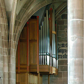 Nicht die Orgel, sondern den Gemeindegesang stellten die Begründer der evangelischen Kirche in den Mittelpunkt geistlicher Musik. Mitte des 17. Jahrhunderts legten Dietrich Buxtehude und Franz Tunder mit Abendmusiken in der St. Marienkirche in Lübeck den Grundstock für den Typus „Konzerte außerhalb von Gottesdiensten“. Nach dem zweiten Weltkrieg mit der Schaffung des hauptamtlichen Kantors erfuhr diese Form einen enormen Auftrieb als eigenständige Konzertform und als Forum für Festivals. Dazu zählt das 1951 gegründete Nürnberger Musikfest, die Internationale Orgelwoche (ION), ausgerichtet in den großen evangelischen Altstadt-Kirchen in Nürnberg, St. Lorenz und St. Sebald. Im Bild: Die Orgel von St. Lorenz, mit 12.156 Pfeifen die größte evangelische Kirchenorgel in Deutschland. Foto: »» lorenzkirche.de