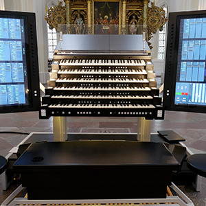 In St. Petri Kyrka in Malmö steht eine der modernsten Orgelanlagen der Welt, erstellt von einem schwedisch-deutschen Projektteam. Die Registersteuerung wird von einem fahrbaren Generalspieltisch aus über zwei große Touch-Bildschirme gelenkt. Foto: www.orgelbau-klais.com