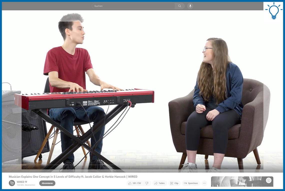 Das amerikanische Magazin WIRED hat Fachleute unterschiedlichster Prägung herausgefordert, ein Fachthema auf fünf verschiedenen Leveln der Expertise zu erklären — mit dabei: das damals 23-jährige Jazz-Ausnahmetalent Jacob Collier zum "Concept of Harmony".