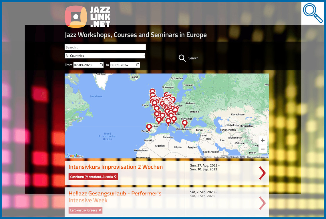 Die dicht gespickte Übersichtskarte des europaweiten Portals zu Workshops, Kursen und Seminaren rund um Instrumental- wie auch Vocal-Jazz zeichnet sich durch ihren Umfang und ihre Aktualität aus. Da die meisten Interessenten eher nach musikalischen als geografischen Gesichtspunkten auf der Suche sind, werden die Einträge unter der Europakarte in chronologischer Reihenfolge kompakt präsentiert.