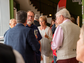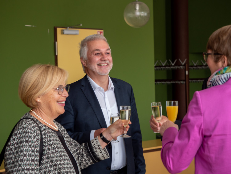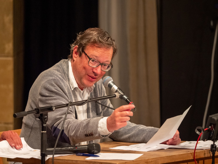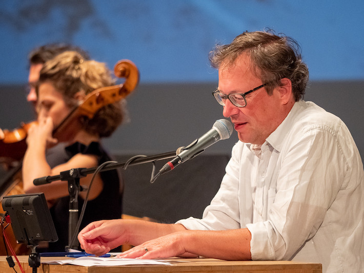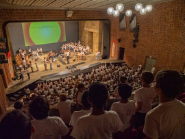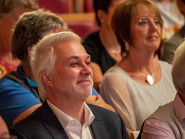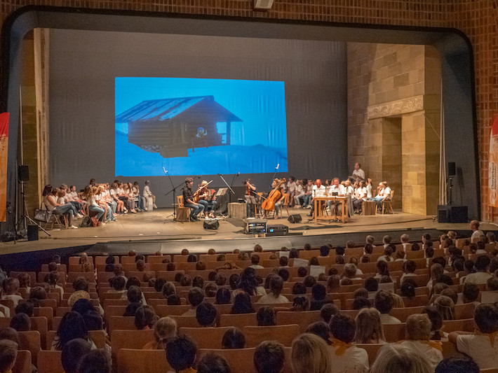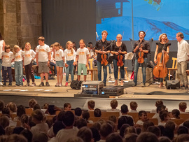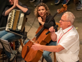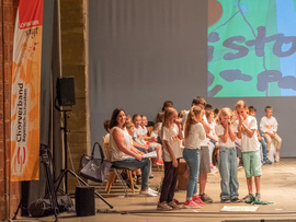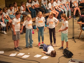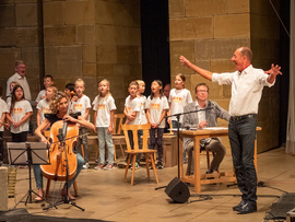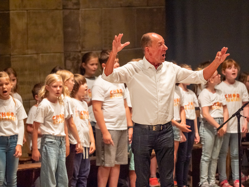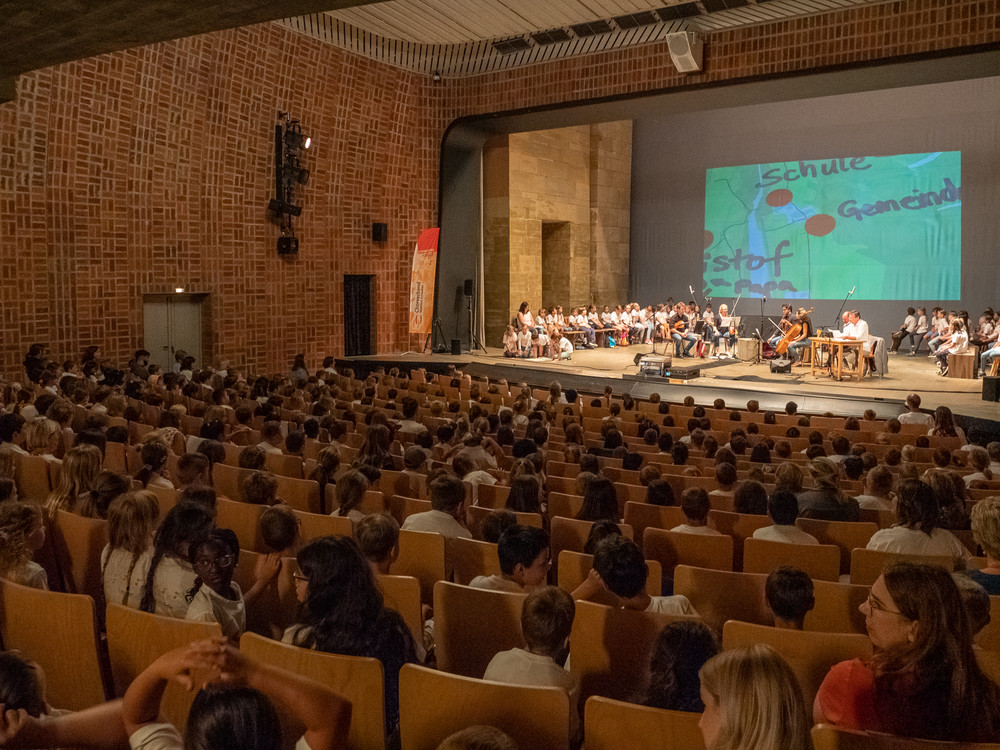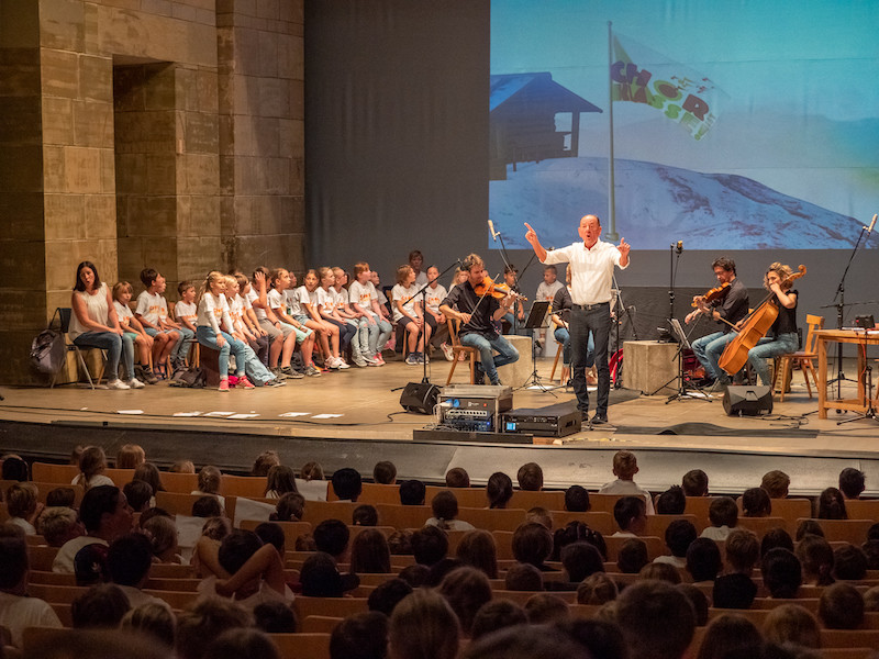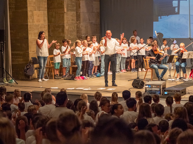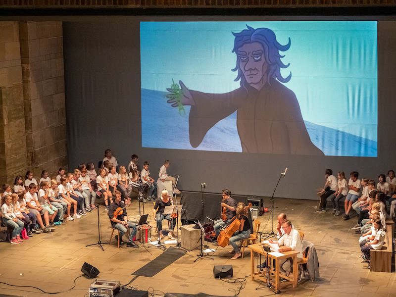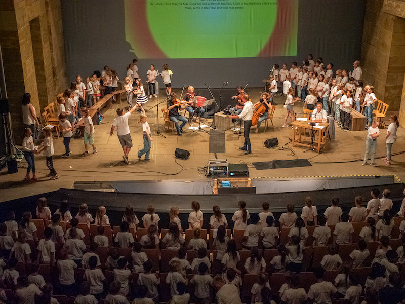 Johannes Hitzelberger las die Geschichte, die NouWell Cousines sorgten mit Streichinstrumenten und einer Steirischen Harmonika für die passenden Liedbegleitungen und inszenierten im spannenden Moment sogar einen Klangorkan. Mit weitschwingenden Armen dirigierte Karl Zepnik die aus voller Kehle singenden Chorklassenkinder auf der Bühne und im Zuschauerraum.