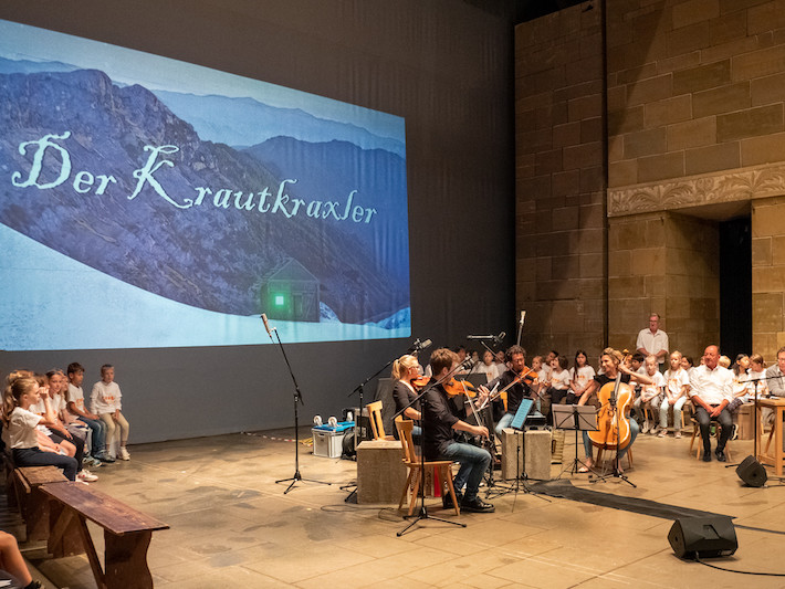 Mit Geige, Bratsche und Cello eröffneten die NouWell Cousines das Musikabenteuer „Der Krautkraxler“, eine fantastische Geschichte von Christiane Franke, erstmalig mit Videos illustriert von Constantino Franke. Fünf Chorklassenkinder spielen in diesem Musik-Abenteuer mit bayerischen und schwäbischen Volksliedern die Hauptrolle. Xaver Schwinghammer, Lucas Freund, David Igel, Emmi Albrecht, Theresa Gehring, und Mila Kapfer vertrieben mit spürbarer Lust am Spiel das Wortmonster.