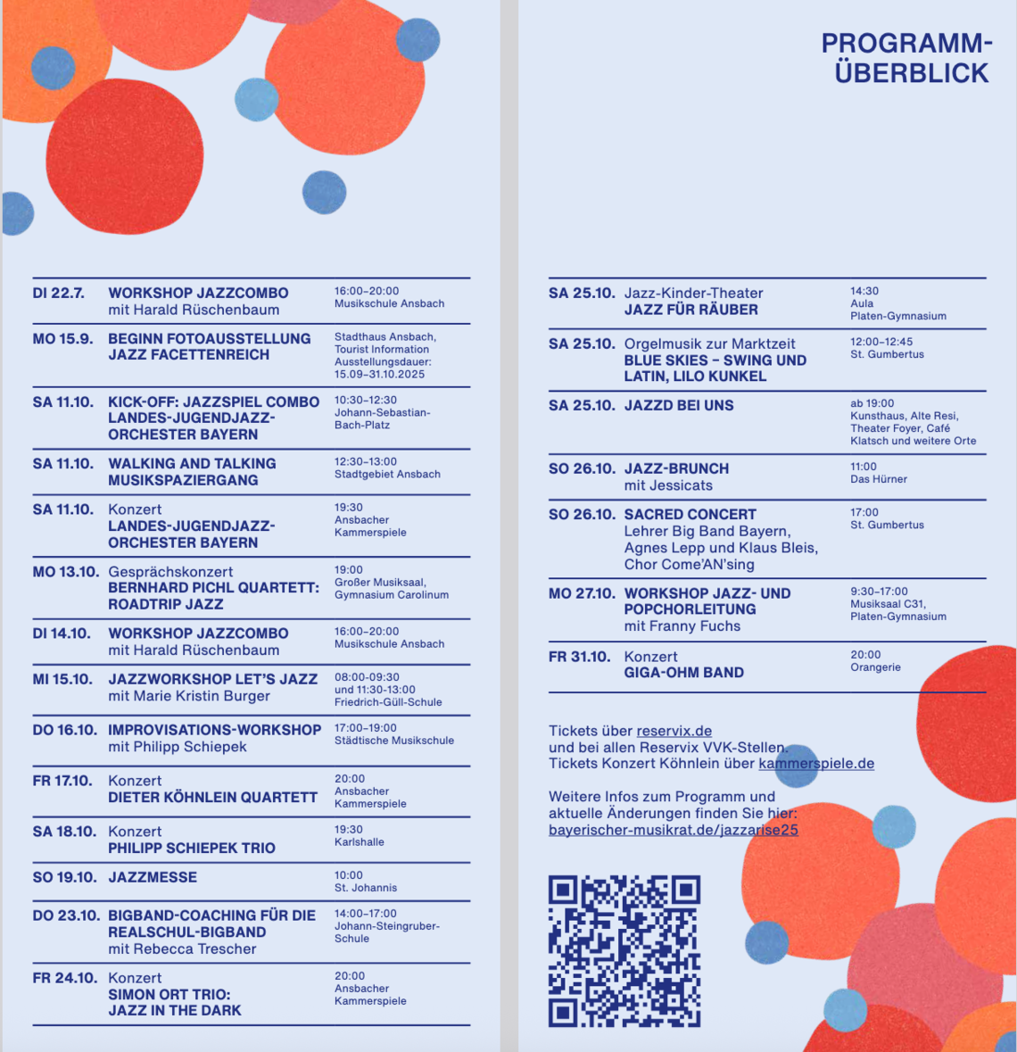 Gäste willigen durch den Besuch von Veranstaltungen im Rahmen von Jazzarise in die unentgeltliche Verwendung ihrer Bilder und Stimmen für Fotograf:innen, Live-Übertragungen, Sendungen und/oder Aufzeichnung von Bild und/oder Ton ein, die in Zusammenhang mit der Veranstaltung erstellt werden, sowie deren anschließende Verwertung in allen gegenwärtigen und zukünfigen Medien und deren Verbreitung auch digital z. B. über das Internet. Die Einwilligung kann gemäß DSGVO jederzeit widerrufen werden. Wenden Sie sich dazu bitte an die Stadt Ansbach oder das Referat Jazz des Bayerischen Musikrats.