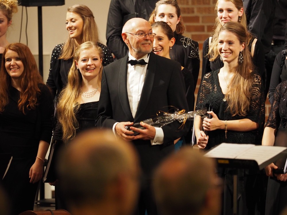 Zum „Chant des oyesaux“ von Clément Janequin konnte man die exquisite Technik der Sängerinnen und Sänger im Chor bewundern. Bei ihren Tschilp- und Kuckuck-Lauten überkam manchen Konzertbesucher große Lust, in dieses polyphone Vogelkonzert miteinzustimmen. Wolfram Buchenberg darf man zu Recht als Spezialist im Umgang mit der Stimme bezeichnen. Das gilt für die menschliche Stimme wie die Instrumentalstimmen. In seinen Trois chansons spürt er französischer Klangart nach und verleiht dem Chorklang aparte Färbungen durch Harfe, Bassklarinette und Klavier. Den Konzertabschluss bildete das vom Chormitglied Thomas Ganzenmüller arrangierte „Mes Main“ auf Vorlagen von Pierre Delanoe und Gilbert Bécaud. In den jazzigen Passagen groovte und swingte der Chor inklusive seines Dirigenten Gerd Guglhör und bewies, dass dieser Chor auch auf diesem Gebiet noch das eine oder andere Ass in der Tasche hat.